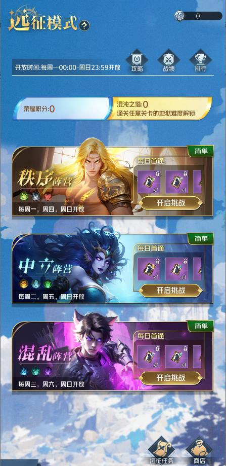 改版后的「远征模式」将分为秩序、中立、混乱三个独立阵营关卡,每个阵营关卡包含简单、普通、困难、噩梦四个难度。通关当前难度后,下一难度自动解锁。每个阵营关卡开放时间不同,但每日挑战次数不设上限,尽情挑战吧!