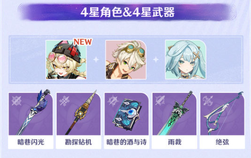 限定4星武器:单手剑·暗巷闪光、长柄武器·勘探钻机、法器·暗巷的酒与诗、4星武器「双手剑·雨裁」「弓·绝弦」的祈愿获取概率也将大幅提升!
