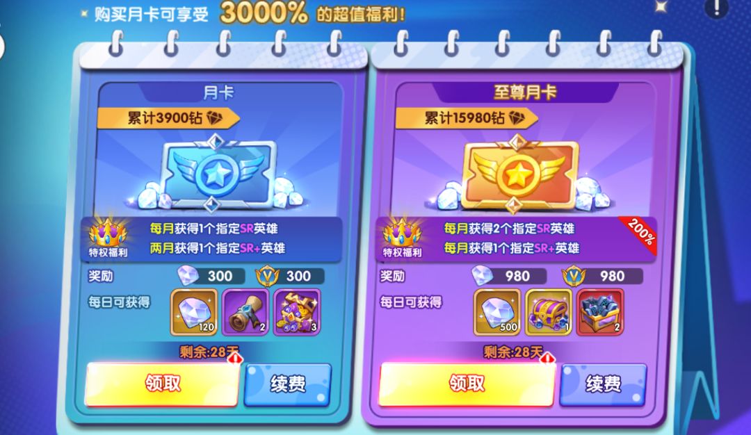 两种卡的性价比还是不错的,比较细水长流,正常游戏月卡都不会拉,所以续月卡也是不会吃亏