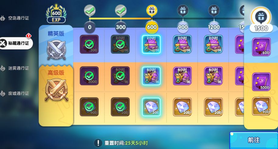 (简单讲下这页通行证)大家可以看到左边有四个通行证。如果想开高级版,前期我建议是选择密藏和空岛通行证,前者可以拿到巨量升级书,而后者可以拿到很多的英雄碎片,我们前期还是很缺英雄的。所以解锁这两个通行证是前期最优解。迷雾通行证拿升级的经验酌情考虑,废墟通行证中后期再说。