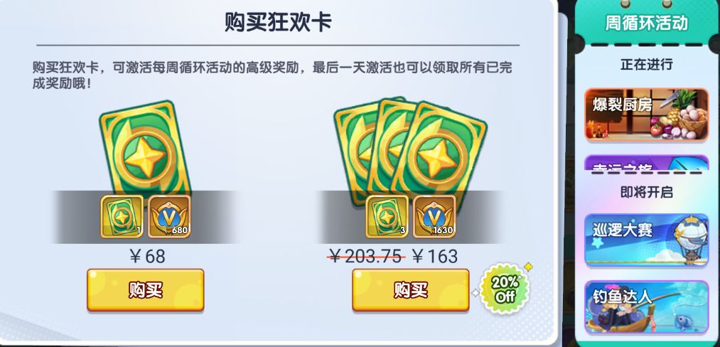 主界面特权福利再点击周活动狂欢卡就能到这个界面 或者在周活动通行证里也能点进来