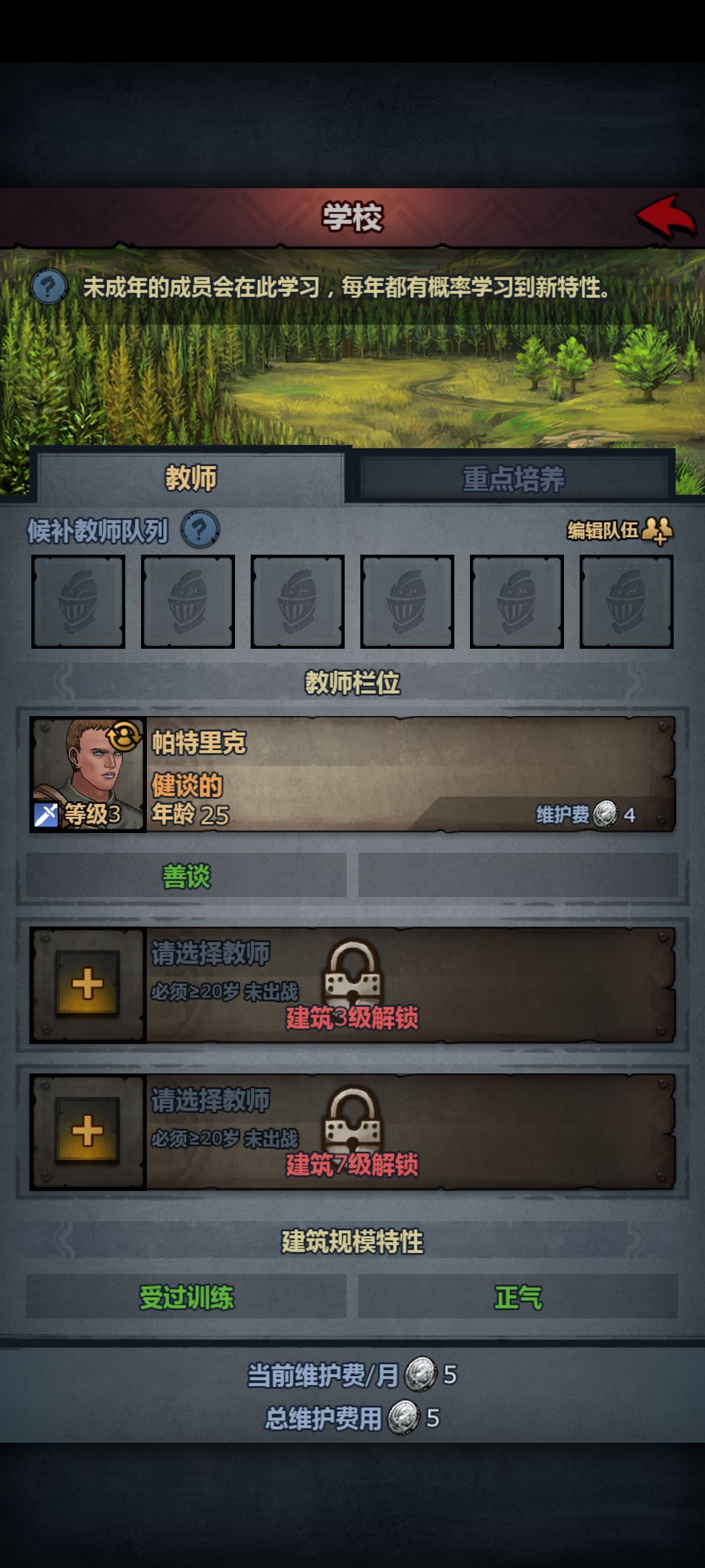所有设施全部建造,训练所,有招到教师的放上,没有就后边放。21级的带队去历练,前期历练都只一年。没有鱼买就行了历练非常赚。