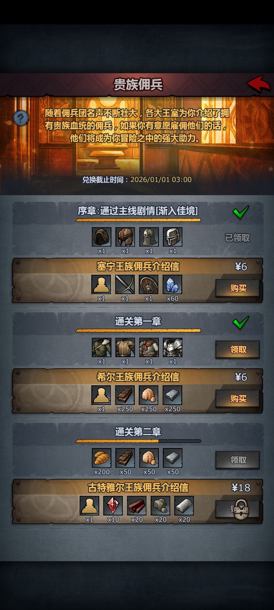 如果是氪金玩家,6元的材料礼包可以看需要买了,林瑜村之前最好四级堡,看能不能历练到精金,不然卡精金很麻烦。希尔佣兵(别的想精通很难,就这个六十多级就能精通)你如果要练王禁的话建议到法拉之后再看,这时候买太早,二十来级就能三转的。