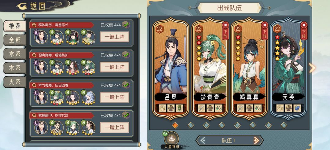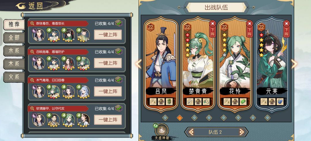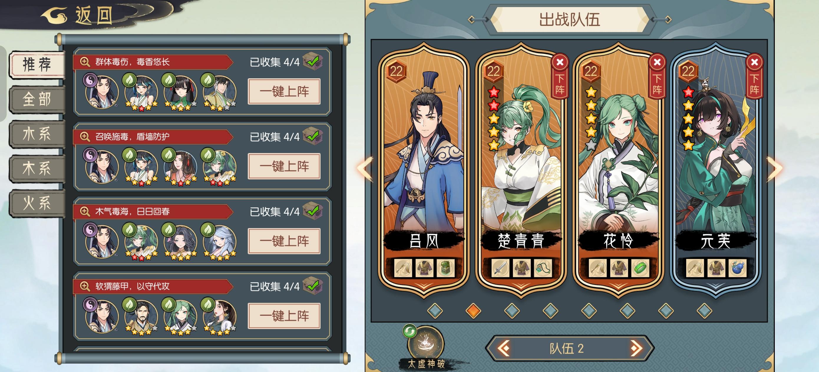 全程只需要用楚青青、元芙、花怜和楚青青、鸠真真、元芙这两套。武器防具可照抄且要求全紫色,饰品方面应该没有玩家能比楼主这套配置还低了,有更好的肯定用更好的。