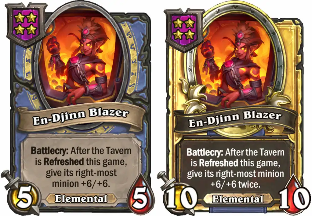 爆焰灯神[4星5/5元素]战吼:在本局对战中,在酒馆刷新后,使酒馆中最右边的随从获得+6/+6。