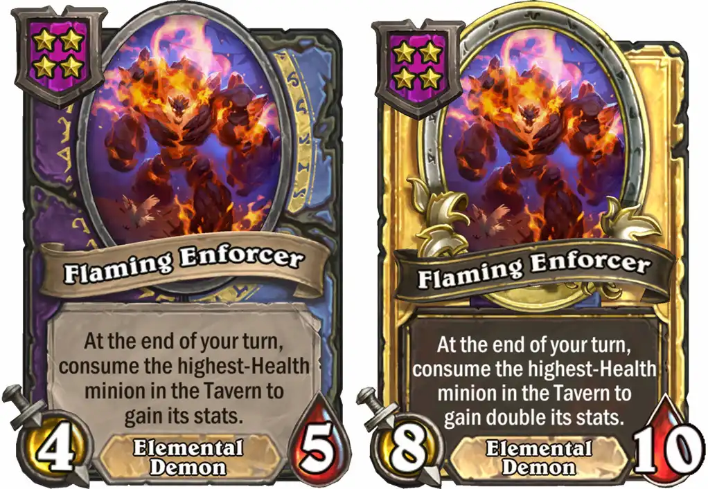 新随从魔焰执行者[4星4/5元素+恶魔]在你的回合结束时,吞食酒馆中生命值最高的随从以获得其属性值。