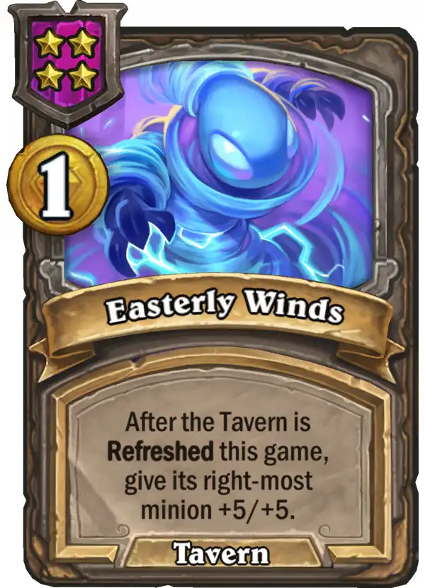 幼体水波[3星6/1元素]亡语:在本局对战中,在酒馆刷新后,使酒馆中最右边的随从获得+3/+3。