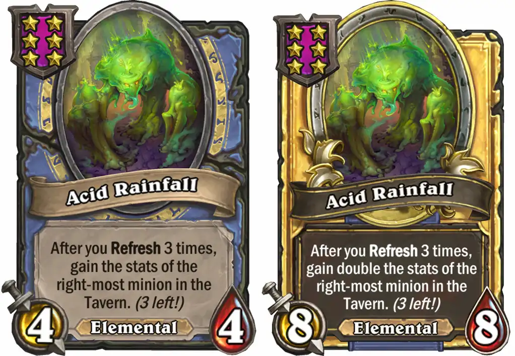 酸雨元素[6星4/4元素]在你刷新3次后,获得酒馆中最右边的随从的属性值。(还剩3次!)