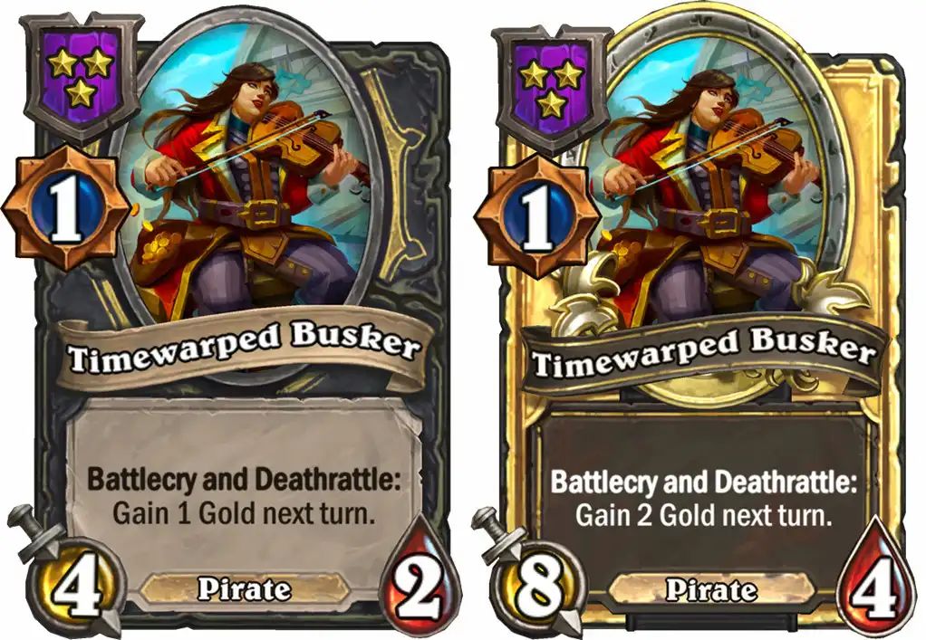 - [2费7/10海盗] 在你的回合结束时,使相邻的随从获得+4/+4。每有一个友方金色随从,重复一次。