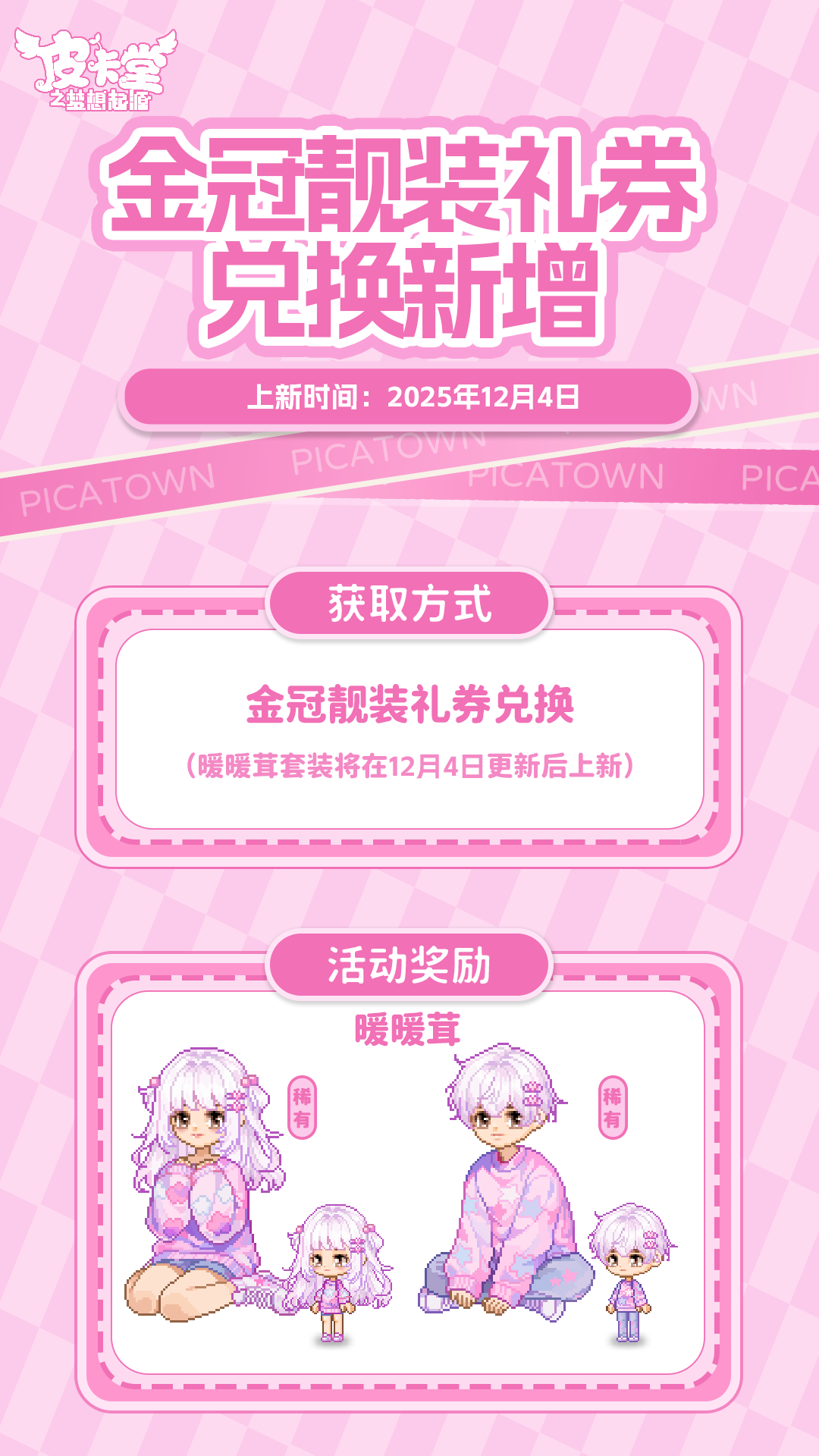 -【金冠兑换】稀有套装「暖暖茸」将在12月4日上架金冠商城,购买金冠可获得兑换道具靓装兑换券。