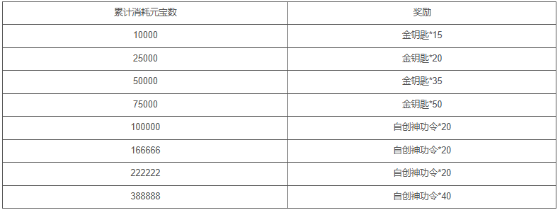 【活动内容】活动期间,累计消耗下方指定元宝数,即可获得奖励!