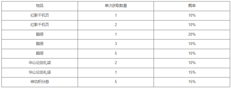 2、可抽取:红影千机页、鹊翎、华山论剑礼袋、神功积分券等超值大奖,100%中奖率!