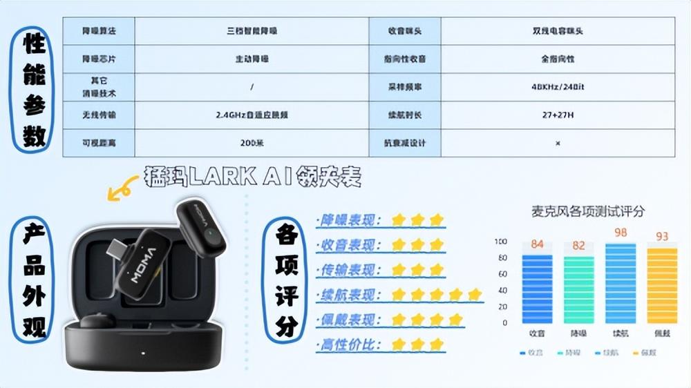 猛玛LARK A1在外观设计上很有辨识度,提供多款亮眼配色,风格年轻时尚,符合潮流审美。在性能方面,该产品搭载泰凌微电子TL721X SoC芯片,支持48kHz采样率与24bit位深的录音格式,结合全指向高性能咪头,最大声压级可达120dB SPL,确保声音覆盖完整清晰。咪芯至UAC输出的信噪比达到67dB,在同级产品中表现扎实。降噪方面,内置EdgeAI技术,提供三档可调节模式,能有效抑制风噪、车流声等环境噪音。在街头、户外等复杂场景中,人声录制依然清晰干净。其传输距离最远可达200米,适合多人拍摄和大型活动使用,信号抗干扰能力还行,即使在无线环境复杂的场合也能保持较为稳定连接。