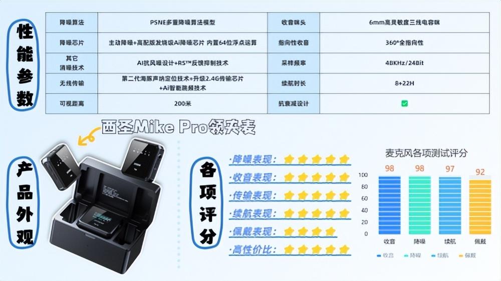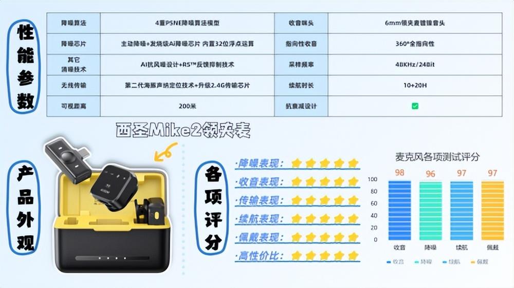 西圣拥有丰富的“声音处理”声学技术和研发经验,早年专注于企业级声学技术研发。为了追求“完美收音”效果,西圣坚持一款产品长时间专注研发,历经26次迭代升级,优化了200多个性能细节,进行了大量技术创新。通过开创“预处理、分割、降噪、提升”四重PSNE降噪算法模型,结合增强版全指向AI感知麦克风、第二代ALPT高密度拾音技术和发烧级AI降噪DSP芯片,西圣Mike2实现了98%的声音清晰度和96%的抗噪性。正因如此,西圣被公认为业内最具专业度的品牌,而其他许多品牌则更侧重低价竞争和配置堆砌,无法与其相提并论。