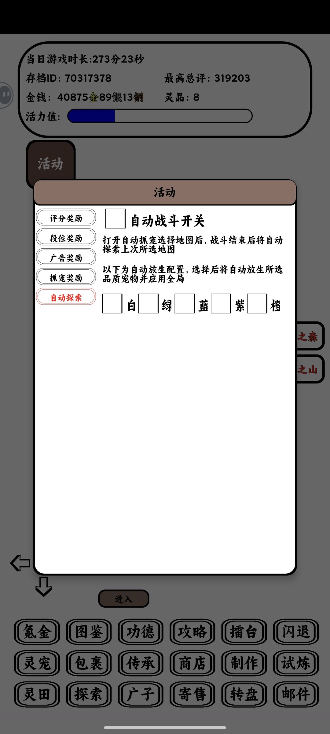 打开后勾选你想要自动抓的宠物,然后在主界面活动一栏点击自动探索,勾选自动战斗和自动放生橙色以下品质的选项。然后回到100级图点击探索开始自动抓宠。