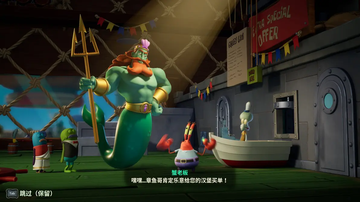 游戏以蟹堡王史无前例的半价活动开始,疯狂的比奇堡海滩居民在蟹堡王没开门之前就堵死了门口。蟹堡王内,开业前的准备正在如火如荼开展,玩家需要操控海绵宝宝完成一系列的准备活动。开业之后,蟹堡王立即排起了长龙,动画中的反派飞行荷兰人想要插队被阻止,放了一堆狠话之后欲要动手,结果镜头一转还是怪怪排起了队(我还是喜欢你桀骜不逊的样子,看来美味蟹堡真的有点东西半价吸引力真的很大)。但这时异变突生,蟹老板迎着海王进来了,还正大光明的插队,直接惹怒了飞行荷兰人,在一次简单的碰撞之后,海绵宝宝变成了鬼魂,海王欺软怕硬也灰溜溜逃走了,蟹堡王在飞行荷兰人愤怒的爆炸中飞上了天(完美复刻动画内的角色性格了)。