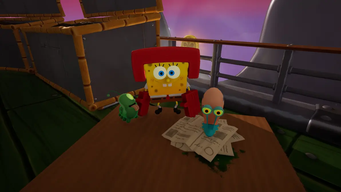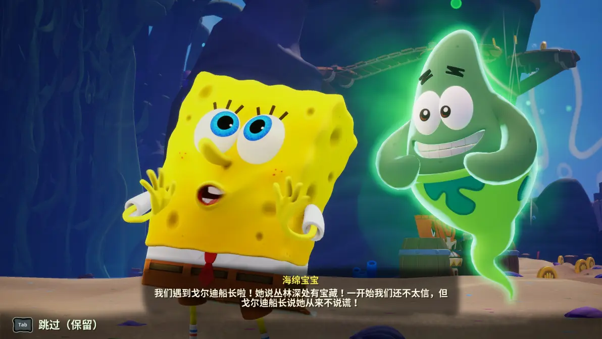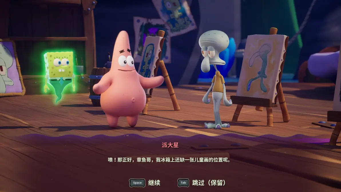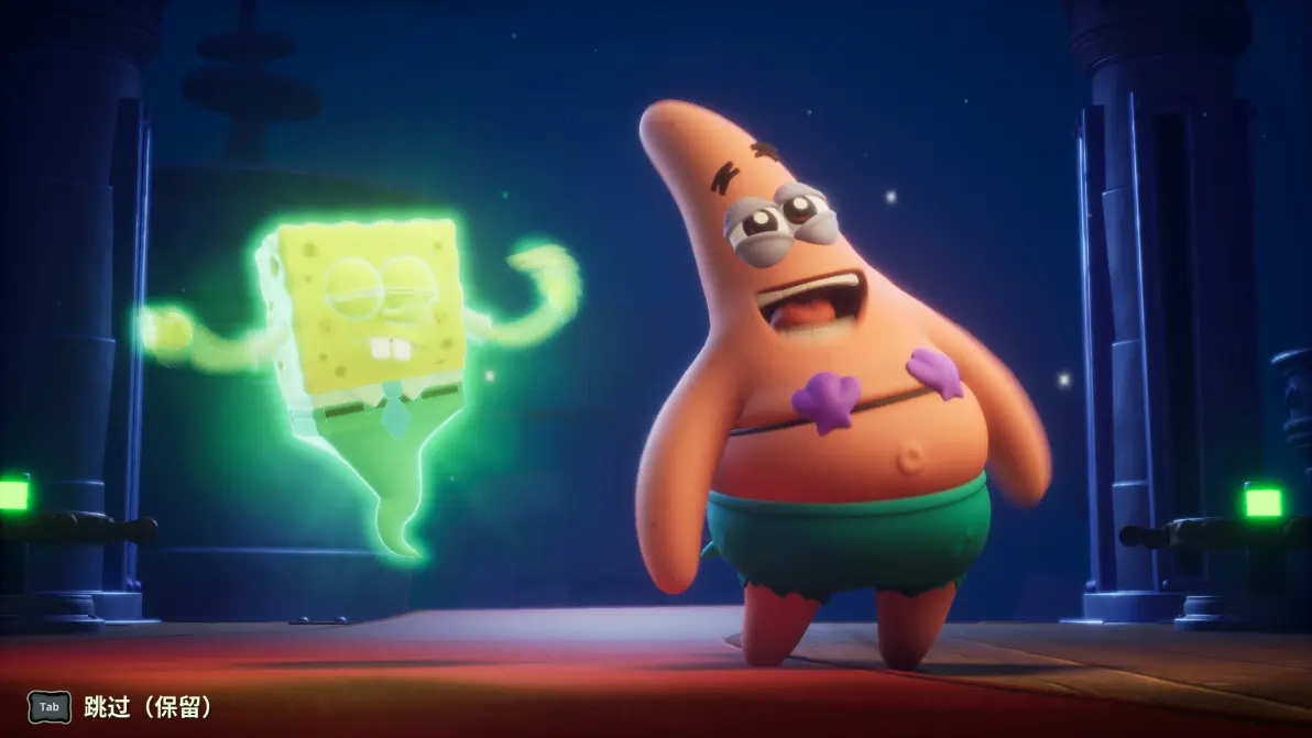 随后游戏正式开始,派大星找到了飞艇上的蟹堡王一行人,因为和海绵宝宝的好朋友指环,玩家可以在海绵宝宝和派大星之间来回切换,派大星可以在沙地上潜入地下然后和一些重物交互,海绵宝宝可以下落攻击各有特点。玩家需要操控两人寻找方法使比基尼海滩恢复原状。