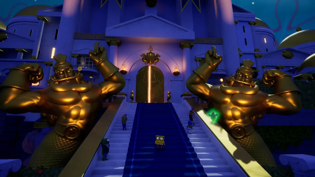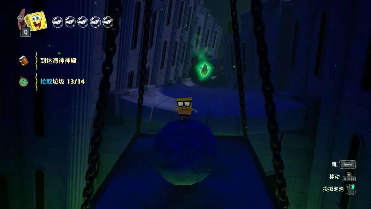 在海神宫殿里,这是游戏中比较重要的一章,飞行荷兰人和海王的冲突白热化,海绵宝宝解锁了吹泡泡道具派大星可以用鞭子,由此衍生出了一些新的解谜交互玩法,还有蓝色和绿色的场景虚化道具,整个解谜地图也是回环设计。