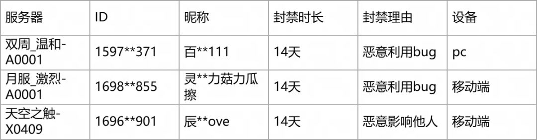 以下为近期因违规处罚情节较重的玩家公示名单,相关角色已进行复核,违规属实。如有任何疑问,请通过游戏内客服进行反馈。