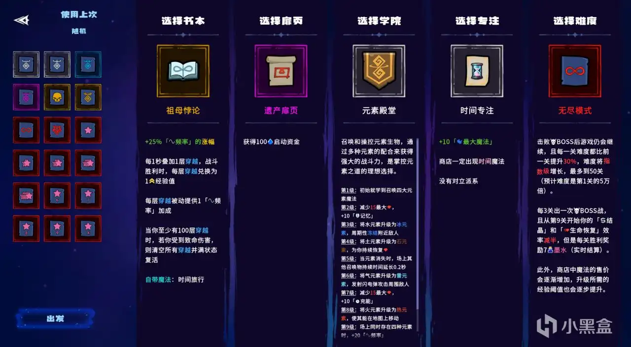 元素殿堂元素殿堂最最最最核心的一点便是一级就可以掌握四大元素,这对我们来说非常的重要,而且随着逐步使用墨水升级元素殿堂,我们的四大元素还会质变为冰、石、雷、热元素,效果也是飞跃式提升。而在书本选择方面,魔书娘的建议是使用《祖母悖论》,因为这本书的初始技能对于前期缺乏自保能力的我们非常关键,能靠着“时间旅行”大幅减少爆炸技的CD尤为关键,而“时间旅行”还是一个护盾类技能,简直是攻防一体的神书,而且100层时候受到致命伤害直接穿梭满血状态简直无敌了,魔书娘穿梭完就只想问一句还有谁?下面是魔书娘的搭配。
