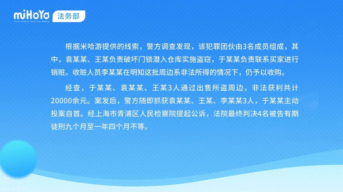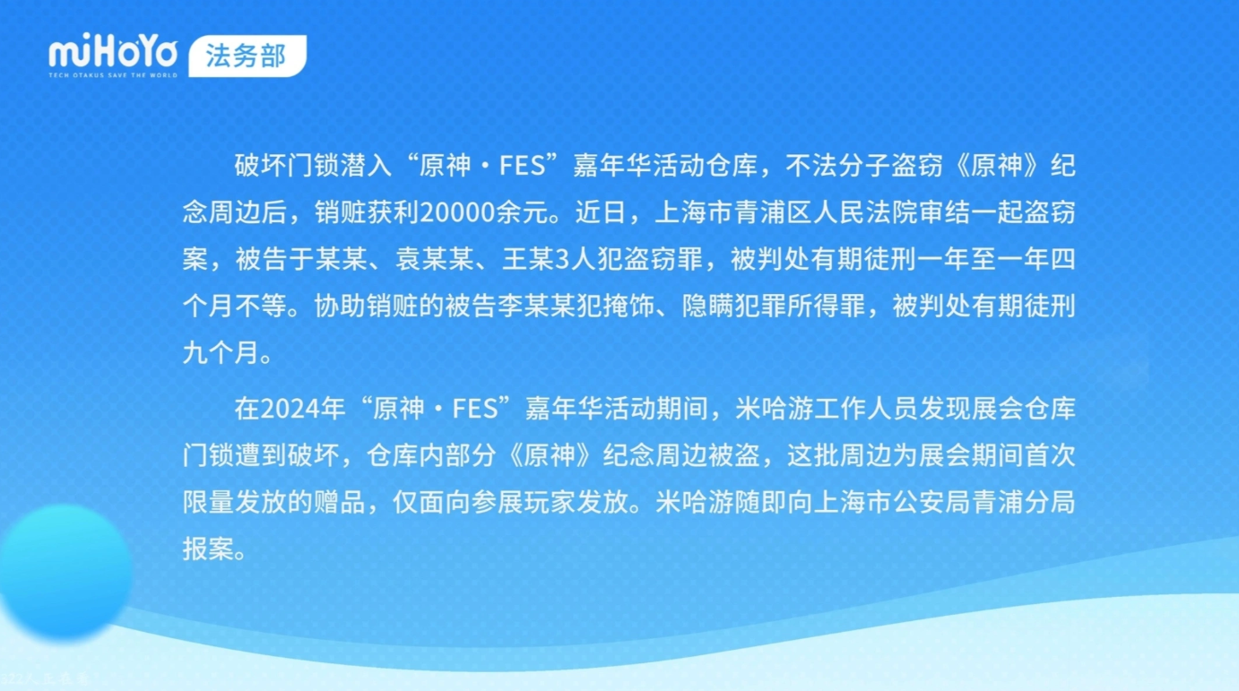 今日,米哈游法务部发布案件通报视频,披露一起“原神・FES”嘉年华纪念周边被盗案的判决结果4名涉案人员已被依法惩处。