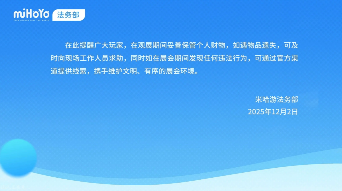 近日上海市青浦区人民法院审结此案,于某某、袁某某、王某因犯盗窃罪,被判处一年至一年四个月不等有期徒刑;李某某因犯掩饰、隐瞒犯罪所得罪,获刑九个月。案发后,米哈游第一时间报案,警方迅速实现全链条打击,涉案人员悉数到案,于某某主动投案自首。米哈游法务部提醒玩家,共同维护展会秩序,遇违法线索可及时反馈。