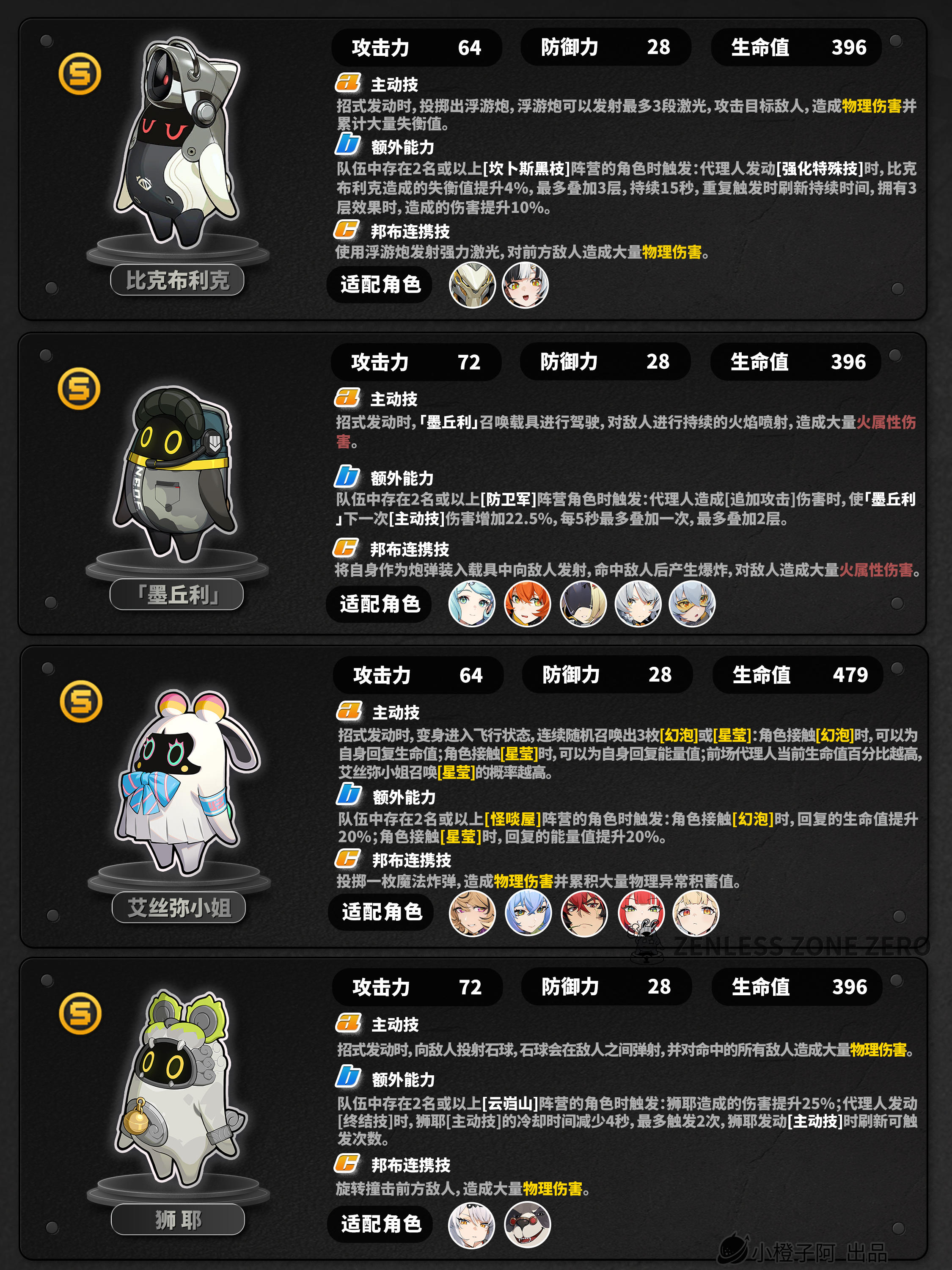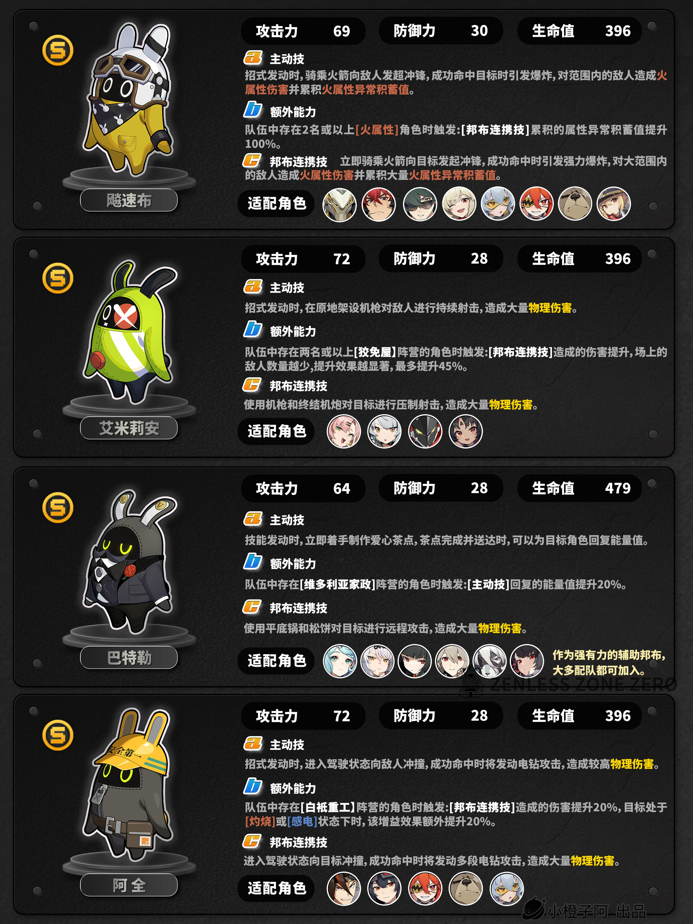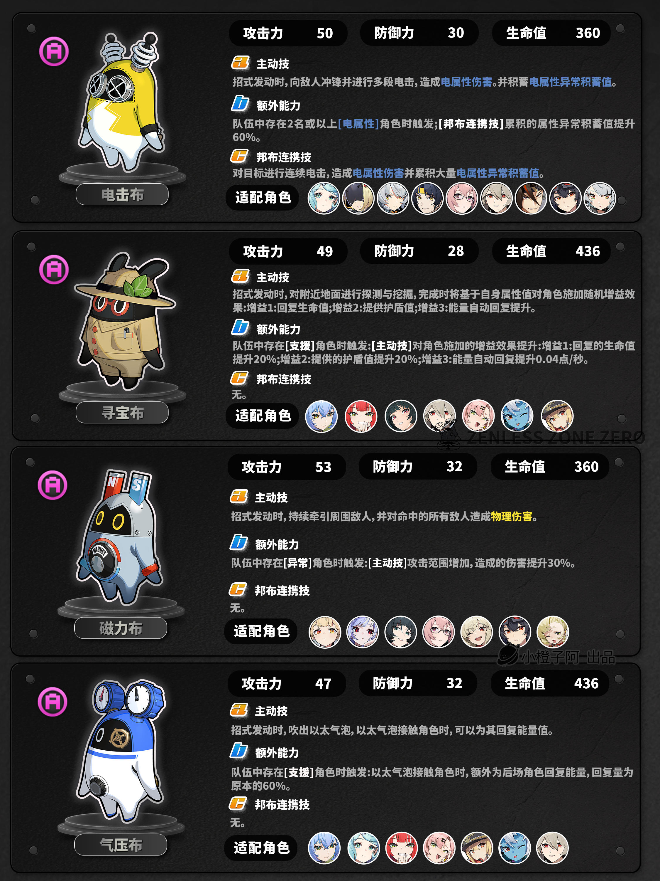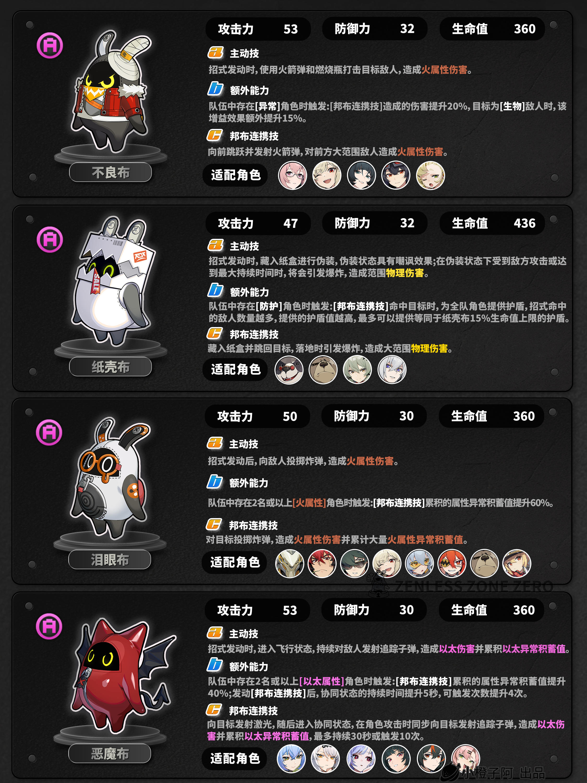 最主要的就是邦布完全免费,只需要通过活动等方式获得嗯呢券就能抽取合适自己配队的邦布,目前有36个邦布,S级17个,A级19个,它们的技能与代理人推荐如上方的图片所示: