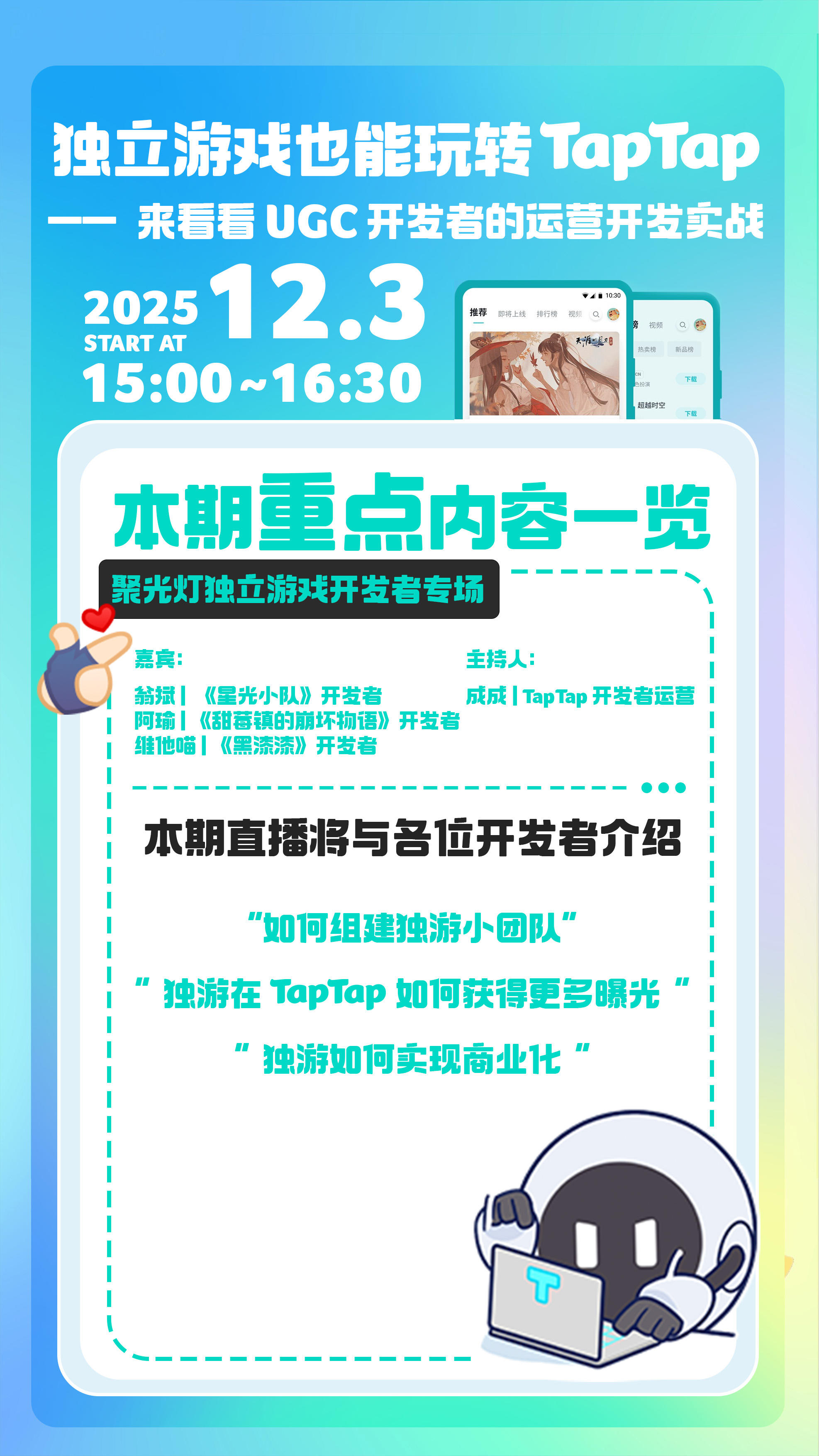 这次我们邀请了 3 位「 聚光灯 GameJam 」的开发者, 来一场真·实战向干货直播👇