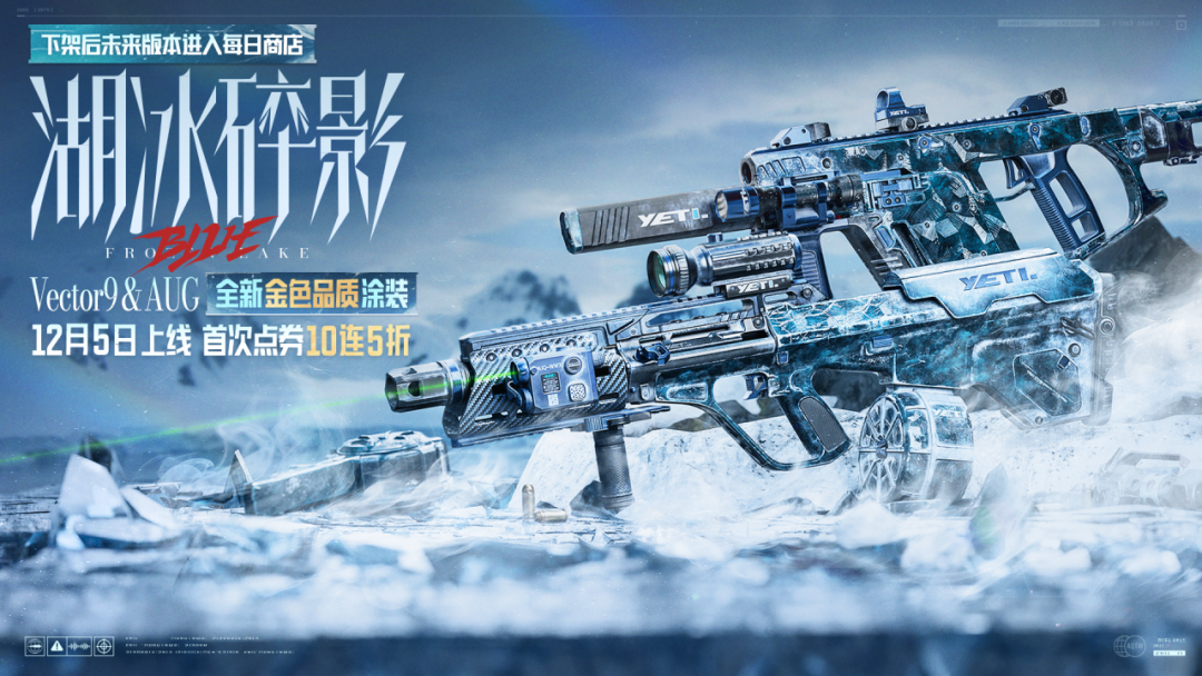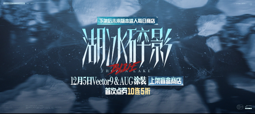 全新系列【湖冰碎影】即将破冰!Vector9、AUG全新枪械涂装12月5日登陆盲盒商店,首次点券十连还有5折优惠。枪械被彻底“冰封”,实战手感究竟如何?来跟老皮一起看看吧!