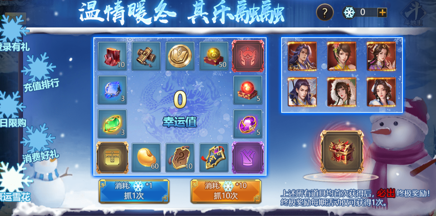① 抓中任意一件「冬日皮肤」或「SP武将」的主公,可额外获得元宝*888