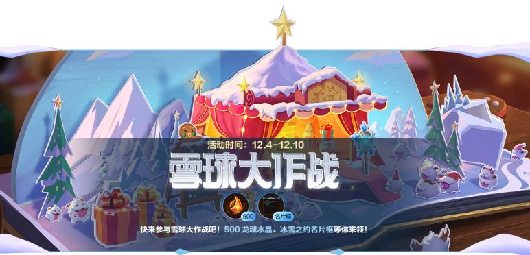 雪球大作战活动将于12月4日11:00至12月10日23:59期间内开启!召唤师完成活动任务即可获得龙魂水晶*500、名片框-冰雪之约奖励~