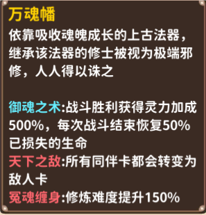 当你所有的残魂都和功法所具有的[七情]词条相同时,才算是万魂幡的最基础的形态(即,此时的每次攻击都能引起五位残魂协同攻击一次)(应该很好理解吧?就是找相同词条,只要和功法相同[七情]的残魂)