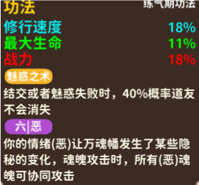 注意,同一[七情]的协同攻击无法叠加,就是说假设你有两本[六|恶]功法,你的每次攻击也只能引起一次协同攻击,无法协同两次(还有就是,没必要只找一种[七情]词条,如果功法里有两个不同的七情,那只要有两种[七情]中任意一个,残魂都能使用)