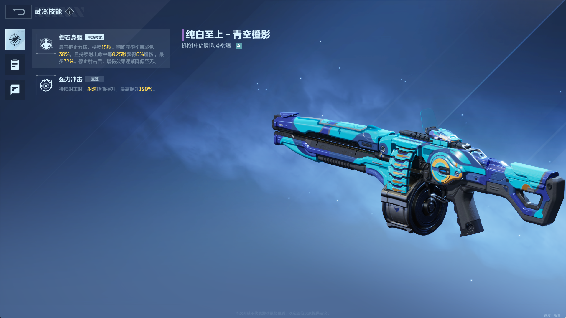 这里以纯白至上进行举例,它的主动技能为获得15秒的减伤和持续射击获得增伤效果,需要保持射击才能获得增伤,停止射击增伤将消失,而被动则是提升射击速度。