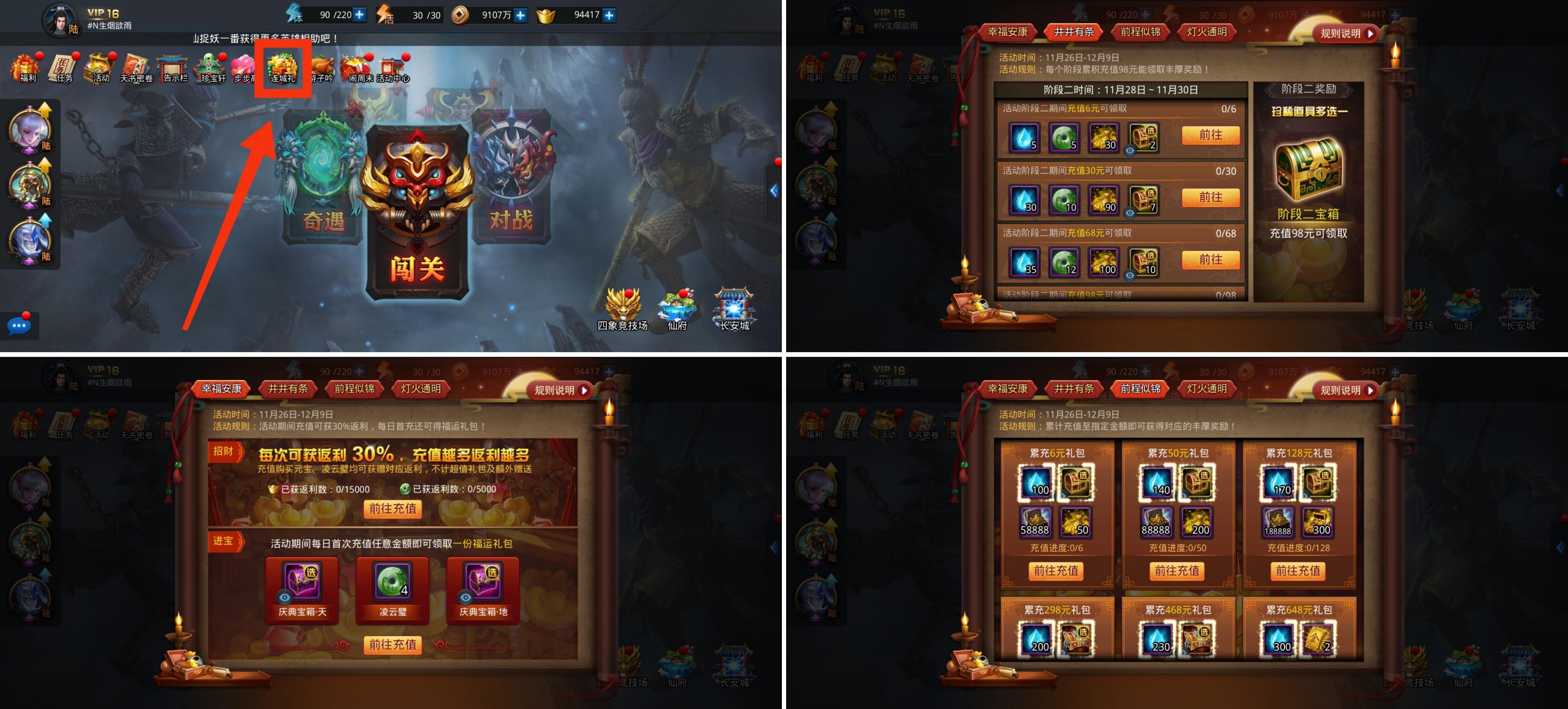 氪金的时候搭配“连城礼”里面充值返利、累充奖励和阶段奖励会有更多奖励哦!