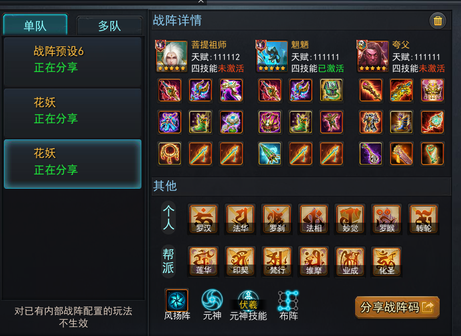2、菩提祖师+魍魉+夸父,法术花妖队基础版,各个玩法都有不错的表现,是微氪玩家首选的法术打花阵容;