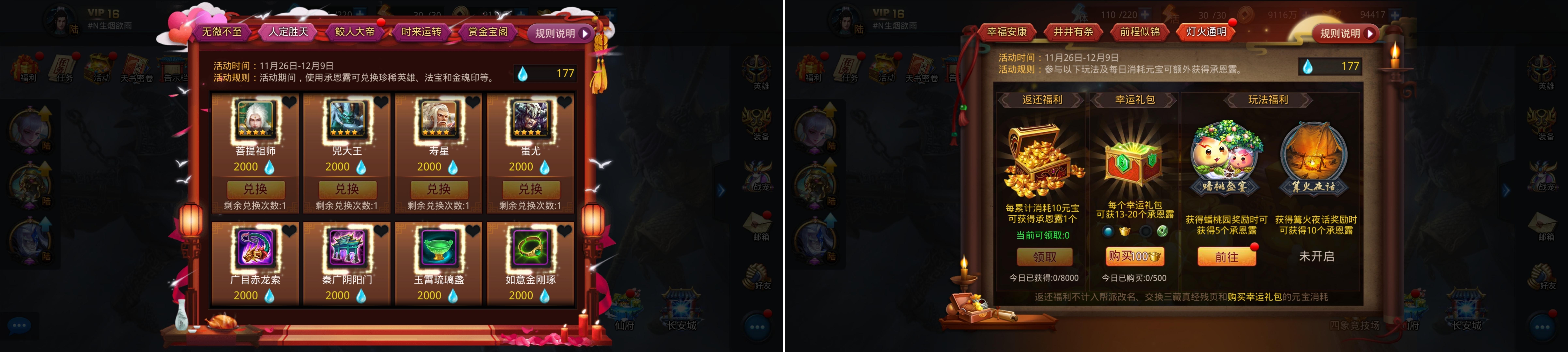 - 卡到活动最后一天(12月9日)集中花费元宝以及消耗承恩露,在这之前通过签到、做任务等尽量多获取元宝;