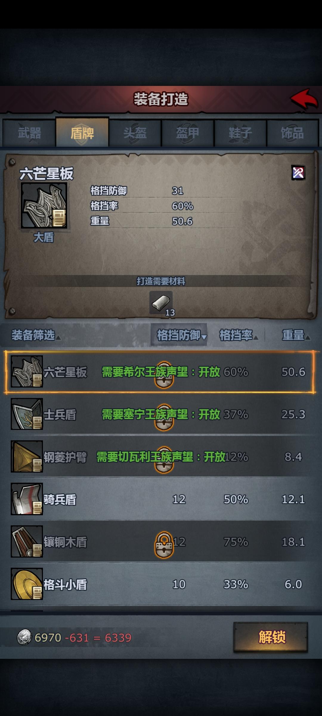 王禁:六芒星板(铁匠铺)或者秘银方盾(圣盾堡),圣盾堡一身白的够打七盾了,想打八盾得买一身蓝,技能带完美格挡,后续要流血需要拦截援护。希尔信赖的话可以做不灭之誓(铁匠铺打在)秘银链甲套(圣盾堡买)