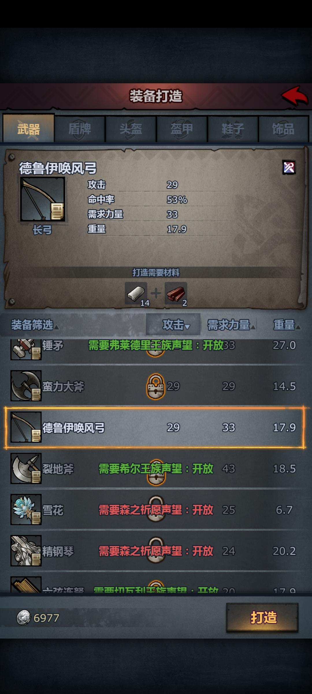 长弓:德鲁伊唤风弓(铁匠铺打造)七盾开始就乏力了,八盾只能射死大德。技能要狙击(打肉必备,没这个就都是0伤害) 布克城后期佩尔信赖后有六级铁匠铺就给做红林弑神弓