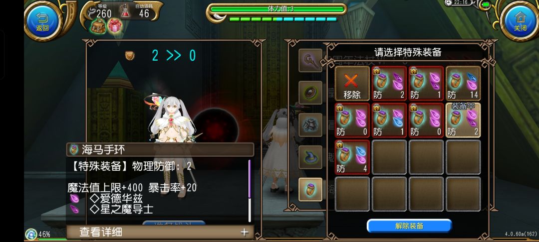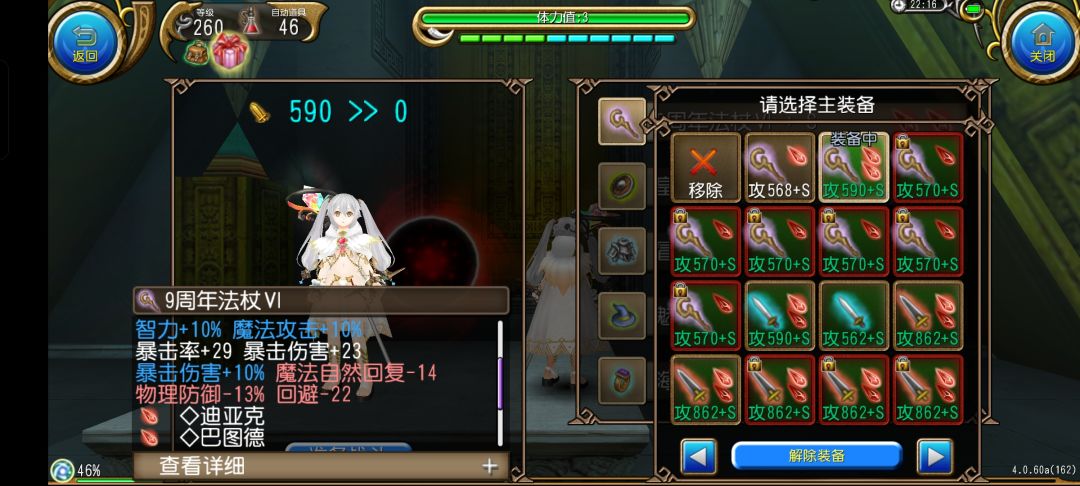 如果想进一步提高暴击和贯穿的话,王掉蔚龙杖也是个不错的选择,但因为蔚龙杖自带水属性所以魔炮的暴击率会略低一些也算有利有弊吧,通用杖单孔的话也可以使用,迪亚克优先,还有,一定不要退HP自回,因为压血的缘故HP上限很低,会导致一脱战血就会扣成1血很难受