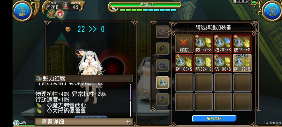 追加的选择就蛮多了,提灯和烟火都能补暴击蛮好用的,咱带红唇是因为自己本身就有毕业也就不多折腾了,行速物抗也蛮香这个看自己喜好搭配就行,如果用提灯的话单孔可以用魔力弗雷西亚,如果选择烟火或者红唇的话就优先大佩,然后就是,用烟火和红唇最起码得保证时装带五点异抗不然异抗满不了