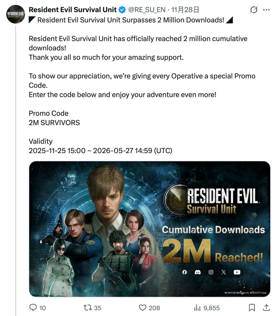 而在11月20日,也就是游戏上线的两天后,官方便宣布《生化危机:生存小队》的下载量已突破100万次。后续,这个数字更是迅速突破了200万。
