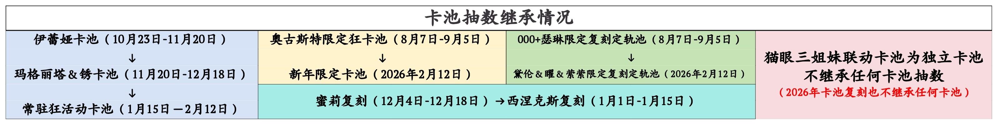需要注意:猫眼三姐妹联动卡池不会继承之前JOJO联动卡池的抽数,为独立卡池