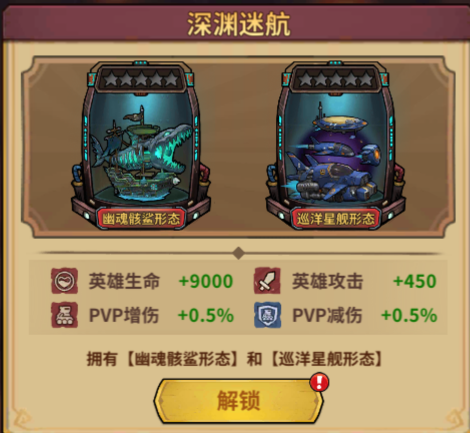 双形态图鉴加成:同时拥有【幽灵骸鲨形态】和【巡洋星舰形态】,即可解锁「深渊迷航」专属图鉴,获得额外加成: