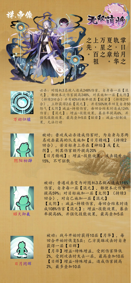 活动期间,可领取试用英雄【帝俊】,试用英雄养成度与玩家英雄综合养成进度相关。试用英雄在虚空幻境内上阵存在试用次数限制,在主线战斗、每日挑战、天界试炼、公会副本、公会试炼、好友切磋等玩法中可无限制上阵。