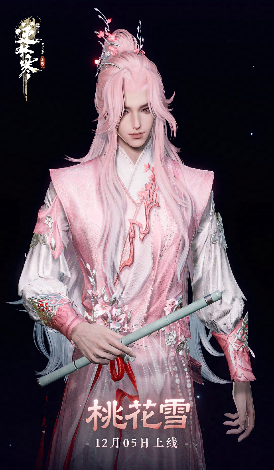 12月5日(星期五)至12月26日,逆水寒全新桃花雪主题时装【桃花雪】将限时上架商城,直售价【2880纹玉】,可使用限定纹玉、代金券、半价券。获取时装后,各位同门还将同步解锁黑发头像、单人动作、双人动作以及群龙之首动画。