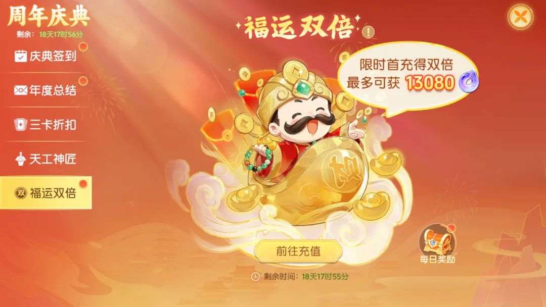 福运双倍充值:限时开启,首充即可享受双倍紫玉返还,最多可获13080紫玉。
