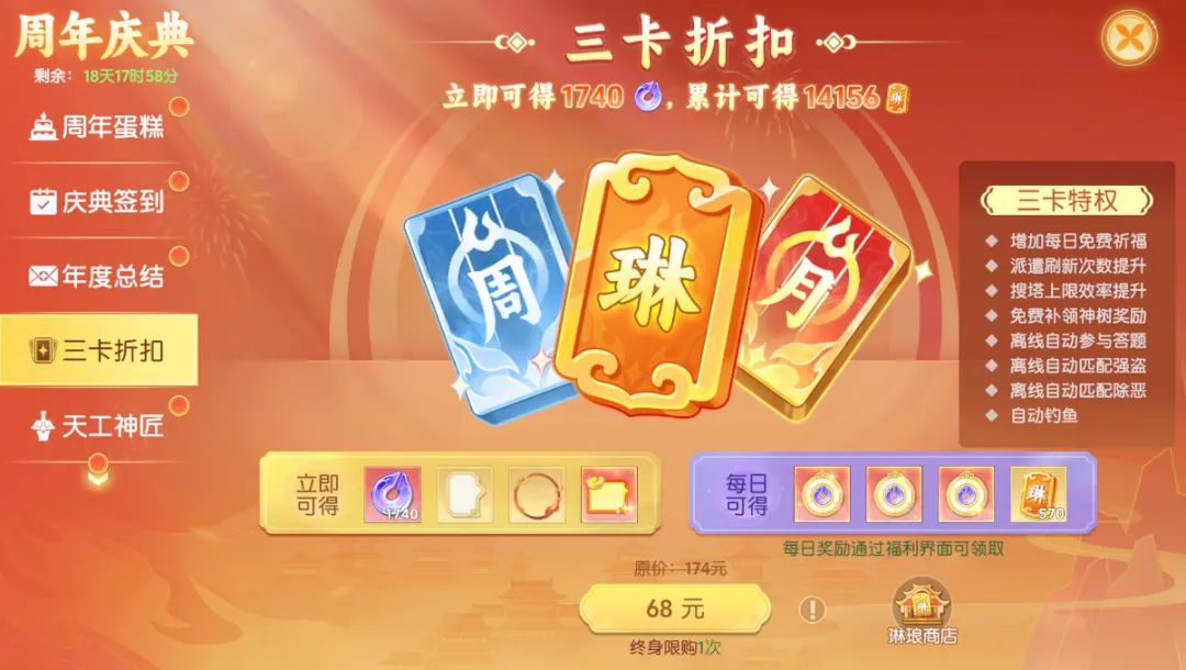 三卡超值包:周卡、月卡、琳琅卡,限时打包价68元。累计可得14156琳琅积分,是性价比最优的长期资源规划。