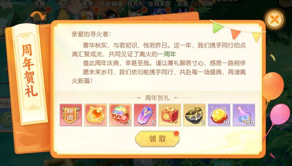 12月5日更新后,所有登录的寻火者,均可直接领取:一周年·专属限定称谓、潜力丹、资质丹、修炼丹、抽奖票券、气运盒子、点化石…为你的每一次尝试增添惊喜。