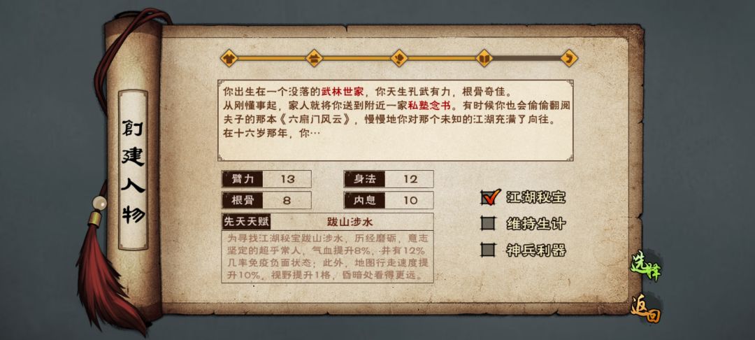 开局选择天赋【跋山涉水】,其他无所谓,我是输出主所以选择臂力和身法尽量高。